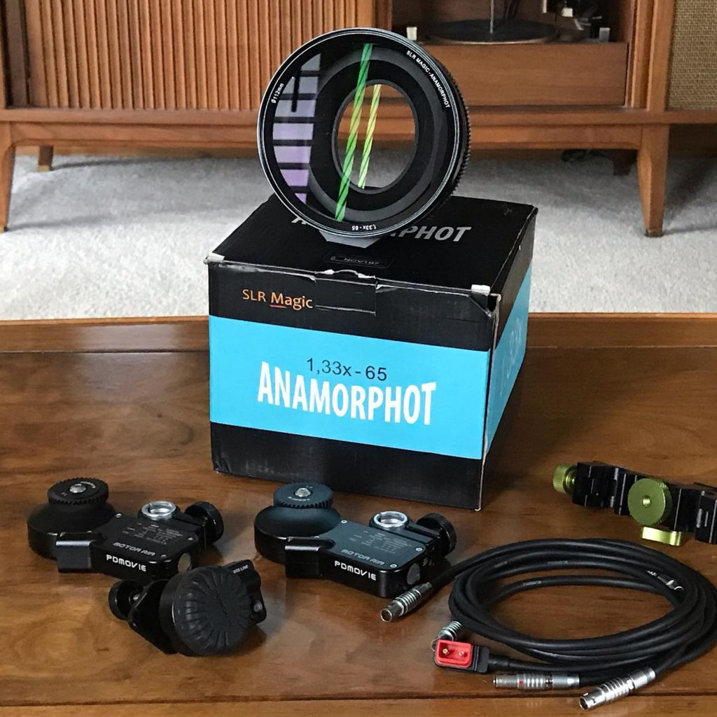 Today, the rental package arrived. I got the adapter itself, along with a lens support (absolutely necessary with a lens adapter this heavy), and this PDMovie follow focus system that’s necessary to focus the lens AND the anamorphic adapter simultaneously.